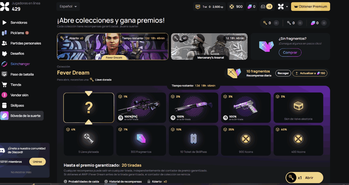 Obtienes xcoins y fragmentos (la moneda interna de la plataforma) durante el juego. Puedes guardarlos e intercambiarlos por skins de CS2, creando así tu inventario sin necesidad de invertir.