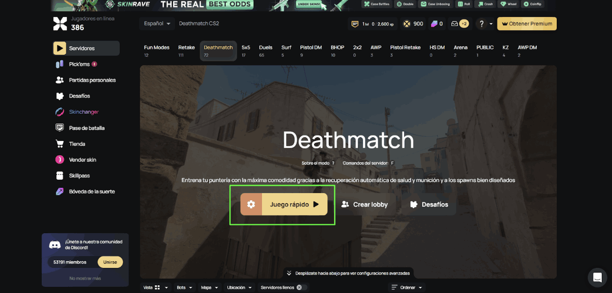 Selecciona un servidor haciendo clic en él y luego haz clic en “Partida rápida” o “Crear sala”.